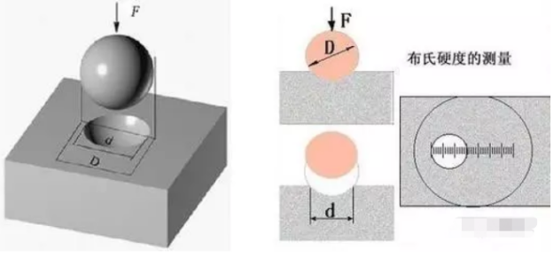 ? ? ? 以一定的載荷(一般3000kg)把一定大小(直徑一般為10mm)的淬硬鋼球壓入材料表面,保持一段時間,去載后,負荷與其壓痕面積之比值,即為布氏硬度值(HB),單位為公斤力/mm2 (N/mm2)。