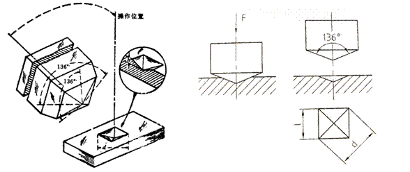? ? ? 以120kg以內的載荷和頂角為136°的金剛石方形錐壓入器壓入材料表面,用材料壓痕凹坑的表面積除以載荷值,即為維氏硬度HV值(kgf/mm2)。